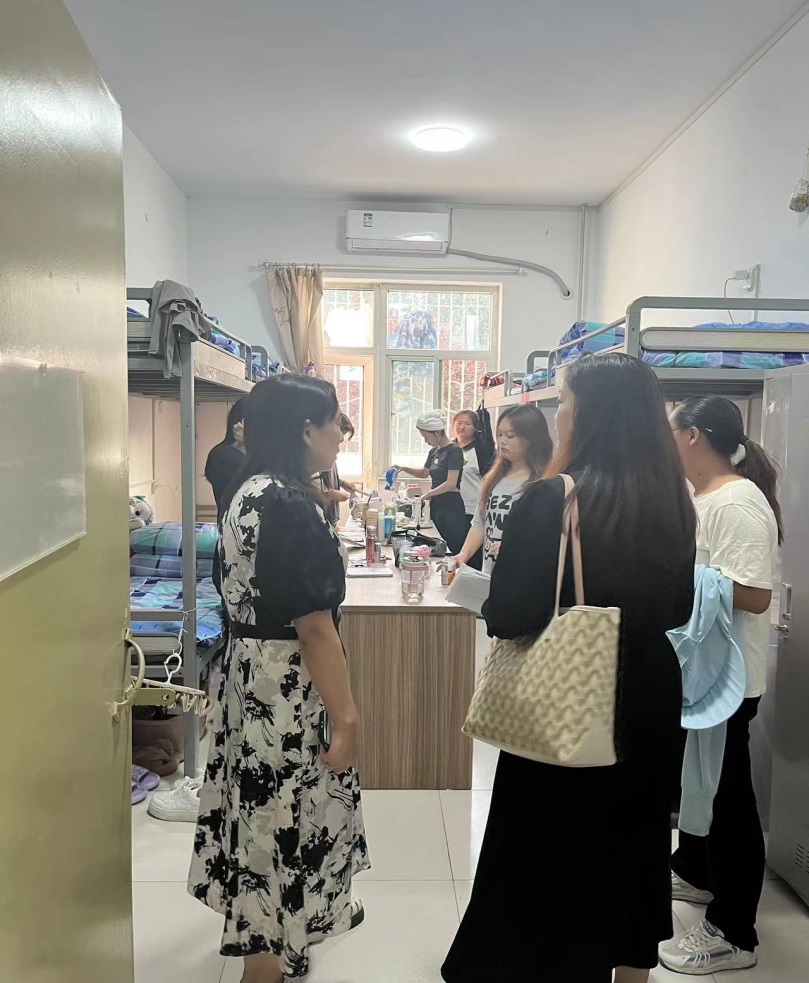 9月10日下午,公共管理系系主任卫云芳老师同系团委书记王宁老师以及系部2023级新生辅导员、班主任老师等一行人进宿舍慰问新生。