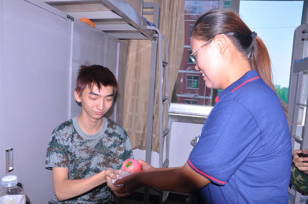 学院有关领导、学工部部长张晋升和各系辅导员、班主任亲手将寓意着团圆与平安的月饼和苹果,连同中秋祝福一一送到每个学生手中,并关照还在军训的新生们尽快适应大学生活,以强健的体魄开启崭新的学习之旅。