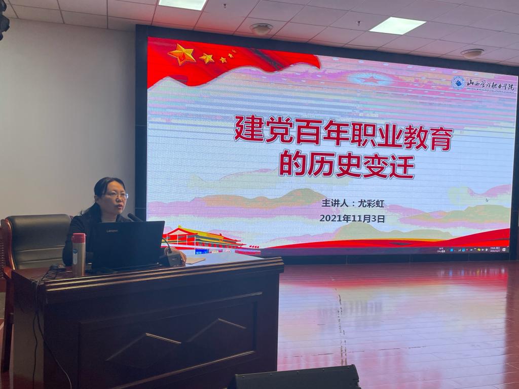 11月3日下午,副院长尤彩虹以“建党百年职业教育的历史变迁”为题,为分管部门,共计70余人,作党史学习教育专题宣讲。