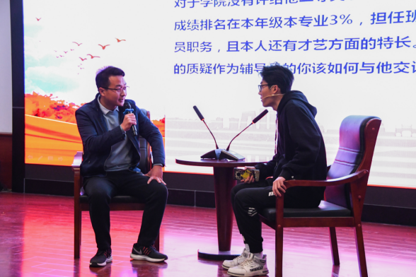 笔试结束后,学生工作部部长张晋升结合我院学生管理工作实际和全国辅导员素质能力大赛新的赛制要求进行了技能培训。他介绍了全国高校辅导员素质能力大赛概况及发展脉络,根据新的环节和赛制要求,分别从基础知识测试、谈心谈话、案例研讨等三个方面做了详细的解读和学习,专职辅导员张泽云和王宁针对各比赛环节进行了现场模拟演练。大家认为,培训内容充实,接地气,既有实用性,又有指导意义。
