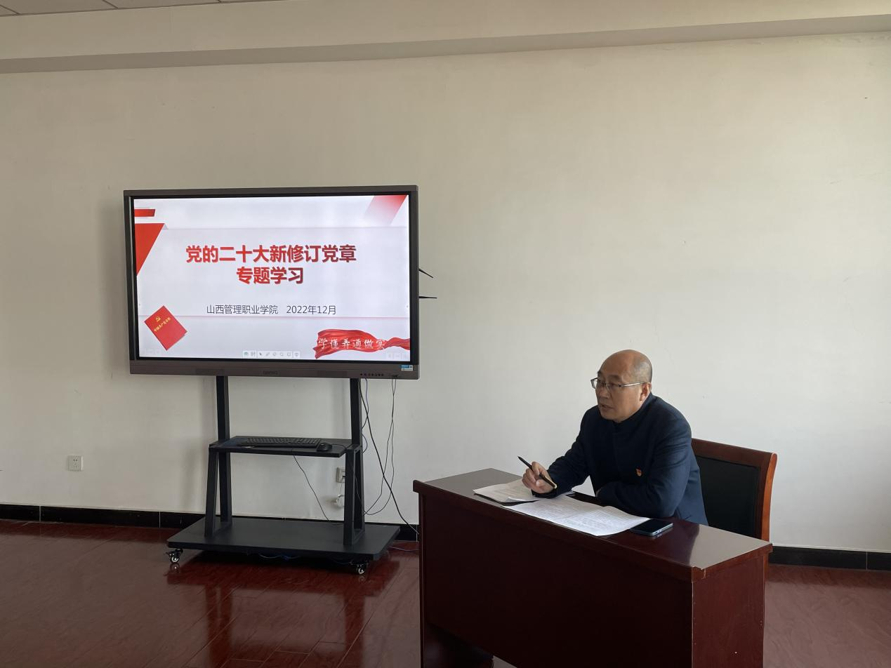 2022年12月13日上午,党委组织部在1206党校会议室举办《二十大党章修正案》专题培训会,特邀思政部主任解晓军作《二十大党章修正案》专题辅导,各党支部书记、专职组织员参加,由党委副书记丁建业主持会议并讲话。