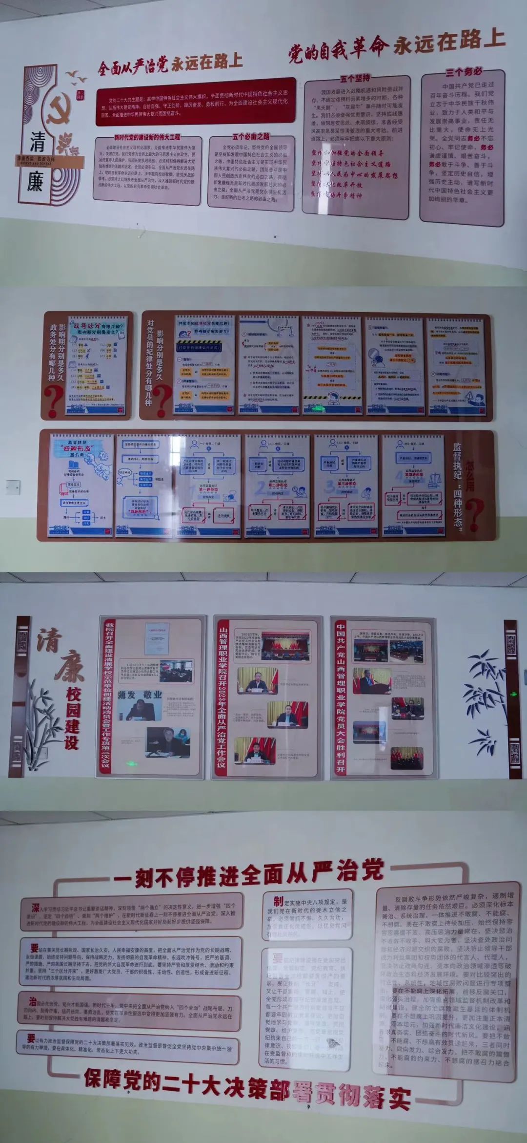 韦阳、王爱国一行参观了学院的“清廉文化角”。“清廉文化角”是建设清廉学校的一项具体举措,是在综合考虑学院实际情况的基础上,充分利用崇德楼11层的楼道一角开辟的清廉文化宣传阵地。“清廉文化角”既包含党的二十大精神中“两个永远在路上”的重要论断、二十届中纪委二次全会的部署要求、监督执纪“四种形态”等纪法知识的普及介绍;又有教育系统的警示画,可以动态更新反映学院清廉学校建设的信息。“清廉文化角”的宣传对推进干部清廉从政、教师清廉从教、职工清廉从业、学生清廉修身等清廉学校建设工作将发挥积极作用。