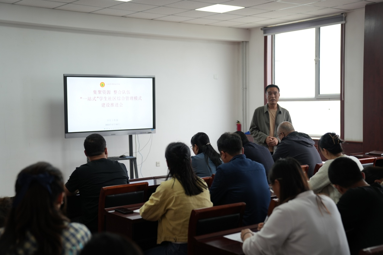 为进一步做好我院“一站式”学生社区建设工作,学工部于5月10日下午3:30在综合楼1206党员活动室主持召开“一站式”学生社区建设工作推进会。院党委副书记丁建业、副院长尤彩虹出席会议,相关部门负责人及三支队伍全体教师参加会议。