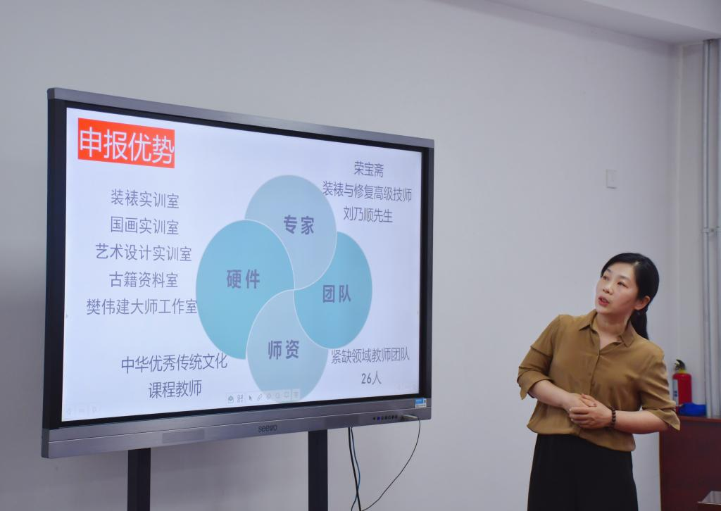 项目负责人、艺术系副教授岳俊萍老师详细介绍了项目成功申报的过程,对项目三年建设期内的实施方案、建设步骤、师徒传承方式、传习所和手工坊的功能及各相关协作部门承担的工作任务进行了全方位的阐释。