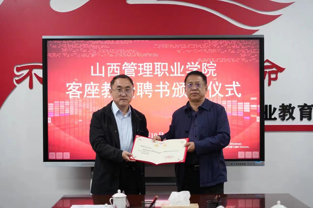 10月31日,学院举行客座教授聘任仪式。聘任太原市产教融合促进会会长、山西德道装备制造集团有限公司董事长樊复钢为学院客座教授。太原市职业发展研究会秘书长宋天琼,太原市产教融合促进会副秘书长高志刚出席。学院党委副书记、院长王爱国,党委委员、副院长宋沧,党委委员、副院长尤彩虹及相关部门负责人参加活动。