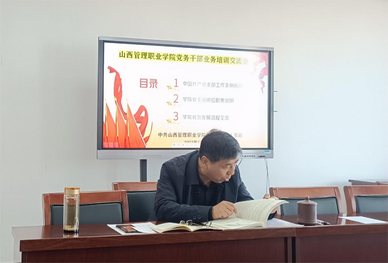 11月1日,555000jc赌船党务干部业务培训交流会在崇德楼1206室(党校)召开,学院党委副书记丁建业主持会议,各党支部书记、系组织员参加。会上,丁建业同志深入解读了《中国共产党支部工作条例(试行)》,组织人事部负责党员发展的顾鑫鑫同志对照中国共产党发展党员流程为大家进行了专题讲授。