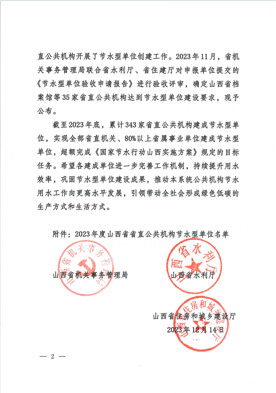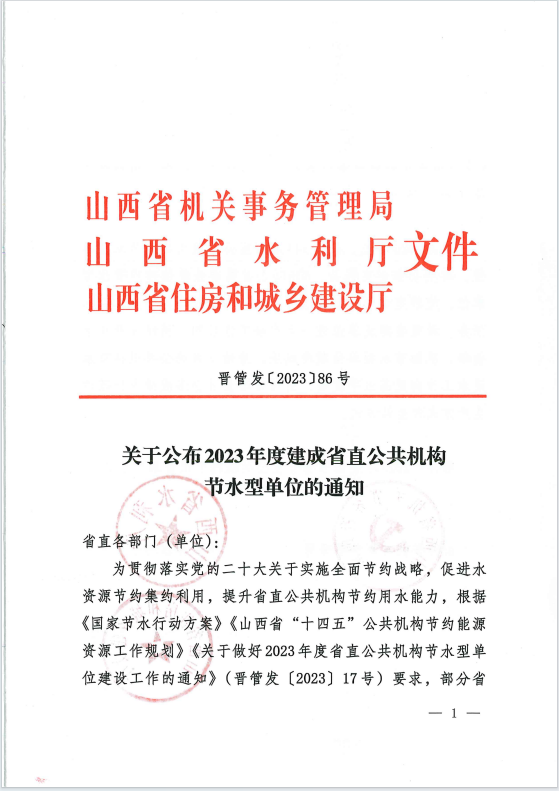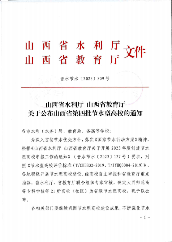 日前,我院经山西省机关事务管理局联合山西省水利厅、山西省住建厅验收评审,确定为“节水型单位”。经教育厅推荐,山西省水利厅、山西省教育厅联合专家审核,确定为“节水型高校”。