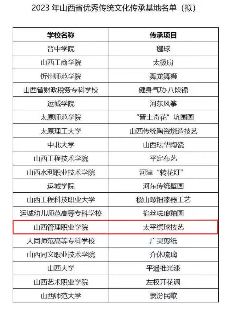 山西省教育厅公示关于2023年山西省优秀传统文化传承基地名单,555000jc赌船“太平绣球技艺”上榜