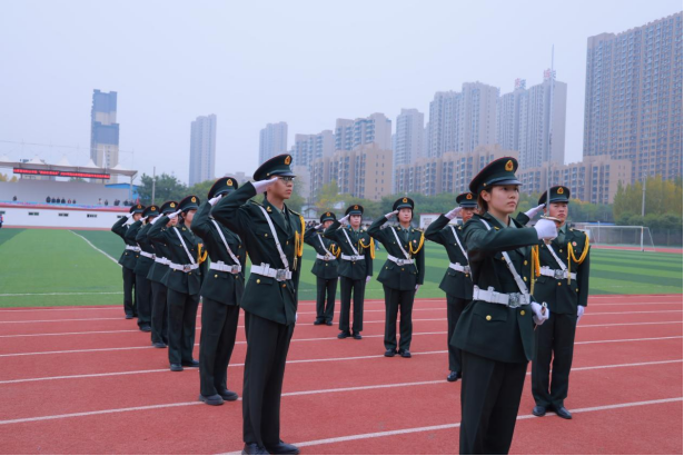 伴着激昂的凯歌,国旗护卫队昂首挺胸,迈着整齐有力的步伐,护送着鲜艳的五星红旗一路向前。伴随着雄壮的国歌,五星红旗在全体师生的注目礼中冉冉升起,飘扬在田径场上方。