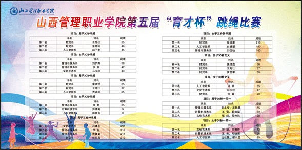 本次“育才杯”院级比赛共有四项,分别是:跳绳、拔河、11人制足球赛、以“青年展风采 接力爱国情”为主题的纪念新中国成立75周年线上校园快乐跑,其中拔河比赛分男子、女子、男女混合共3项;跳绳比赛分男女单人、双人、集体共11项。四项赛事共产生集体奖9个、个人奖和多人奖211个、优秀运动员2名、优秀裁判员23名、优秀工作人员8名。