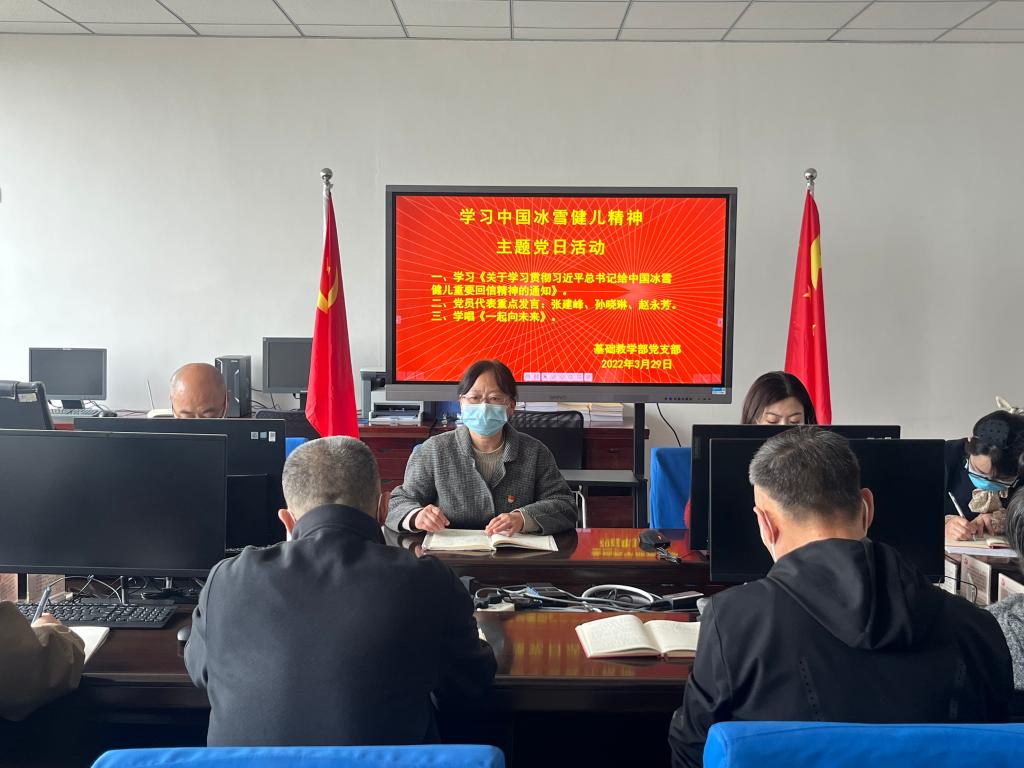 2022年3月29日下午,基础教学部党支部全体党员在崇德楼1117,开展学习“习近平总书记给冰雪健儿重要回信精神”主题党日活动。支部书记秦晶丽主持。