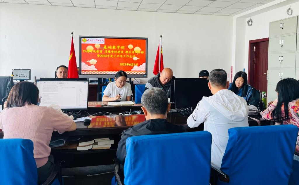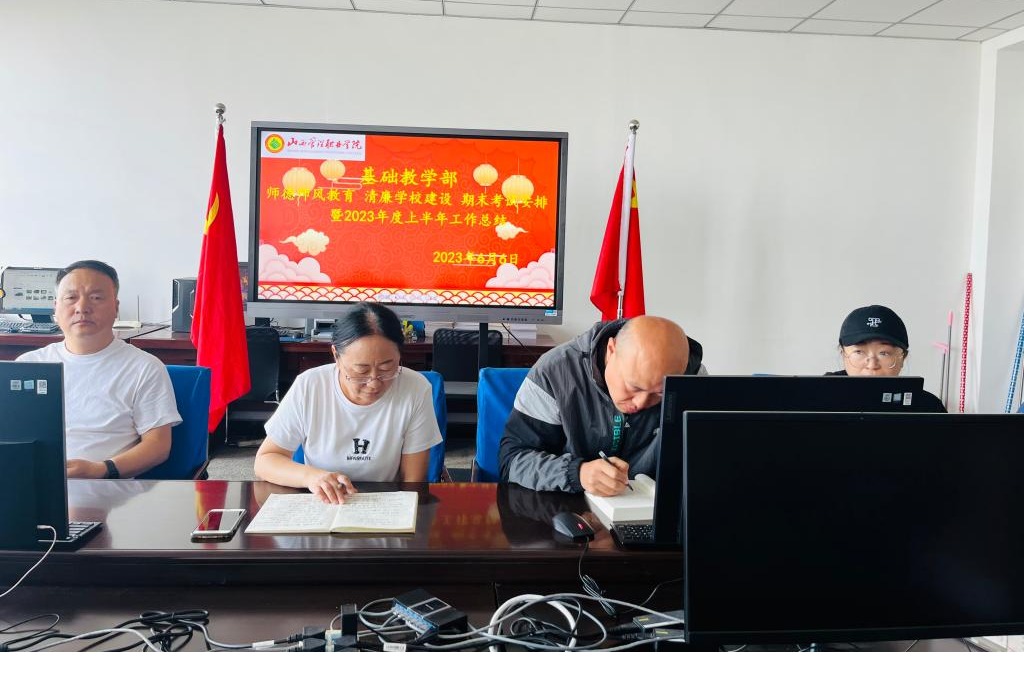 6月6日上午,基础教学部在崇德楼1117室召开师德师风教育推进清廉学校建设、本学期期末考试安排暨2023年度上半年工作总结会议。基础教学部主任秦晶丽主持。基础教学部全体人员含兼职兼课教师参加。