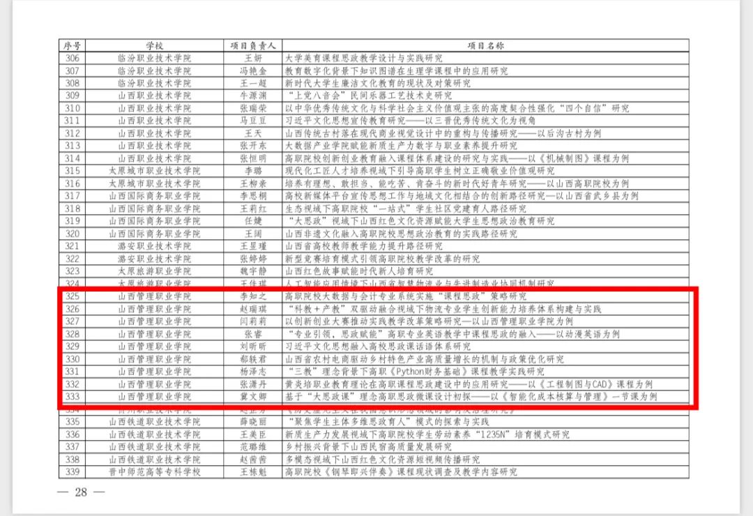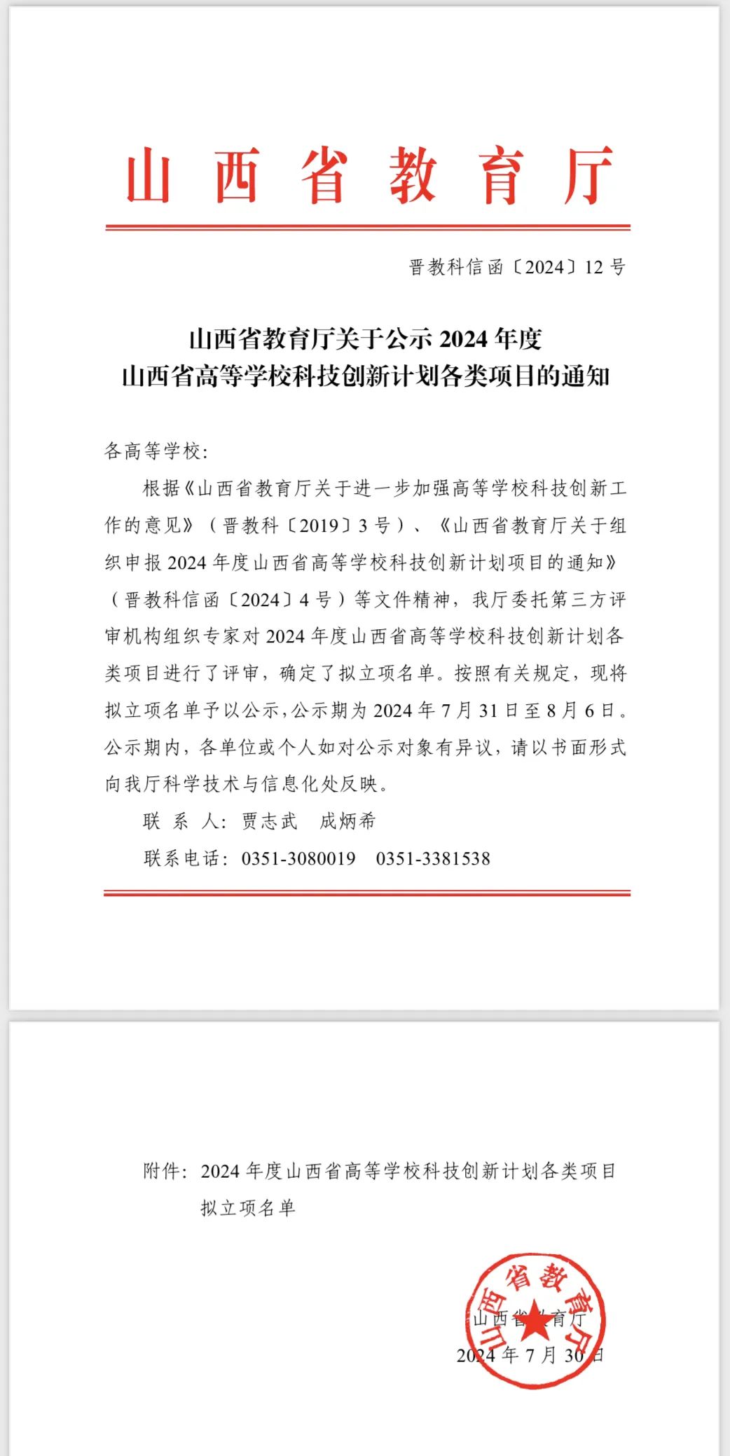 近日,山西省教育厅下发了《关于公示 2024 年度山西省高等学校科技创新计划各类项目的通知》(晋教科信函〔2024〕 12号),我院组织申报的10个项目全部获批立项。