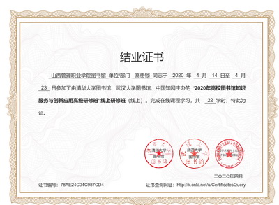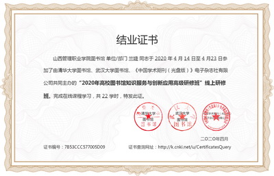 近日,图书馆组织全体馆员参加“2020年高校图书馆知识服务与创新应用高级研修班”线上培训。全体馆员均已完成22学时并通过审核获得研修班结业证书。