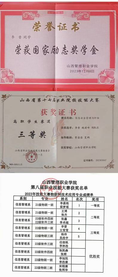 2023年11月,荣获第十七届职业院校技能大赛“信息安全管理与评估”团队三等奖。