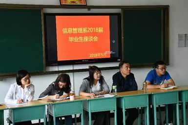 5月24日,信息管理系在综合楼310教室召开2018届毕业生座谈会。系主任尤彩虹,系党总支书记张治国,系分团委书记张晓通,毕业班班主任姜安莲、顾鑫鑫,专业教师贾蓓蓓及26名毕业生代表参加了座谈会。