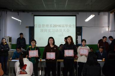 11月26日上午,信息管理系2016届毕业生顶岗实习动员大会在教学楼举行。系党总支书记张治国,主任尤彩虹,副主任王雪霞,系团委书记张晓通和毕业班班主任出席会议。大会由系办公室主任马宁主持。