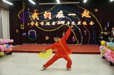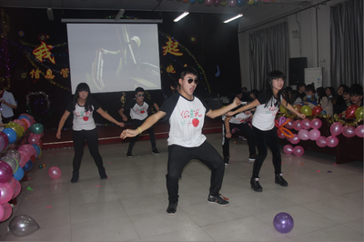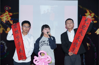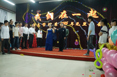 布展一新的报告厅内外处处洋溢着欢乐喜庆的节日气氛。闪烁的彩灯、五色的拉花将舞台布置的缤纷绚丽;鲜艳的中国结,彩色的气球将报告厅装扮的喜庆祥和。晚会伊始,系主任孔丽琴发表了热情洋溢的新年致辞。伴随着激昂的旋律和璀璨的灯光,晚会在充满激情活力的舞蹈《倍儿爽》中拉开序幕。歌曲《夏天的风》、《如果这就是爱情》、《团委的你》等唱出了学子们的懵懂青涩时光;T台秀《I Like Girl》、现代舞《小苹果》、交谊舞《相逢是首歌》、歌曲《相亲相爱》等展示了当代大学生的青春与活力;古典舞《月犀扇》在领略力与美结合的同时,感受到学子们的青春与梦想;张文斌老师和儿子张博然表演的双簧《放炮》充满童趣,令大家捧腹大笑;曹晨东同学演唱的歌曲《一生有你》旋律优扬,声情并茂,赢得了热烈的掌声;小品《卖萌》和双簧《检查卫生》表演的惟妙惟肖,博得了满堂喝彩。此外,导演组还在节目间隙穿插了黄金60秒等互动游戏,让师生成为晚会的主角。随后,动感十足的舞蹈《迪拜》将晚会推向高潮。历时一个半小时的晚会在同学们意犹未尽的喝彩声中完美落幕。