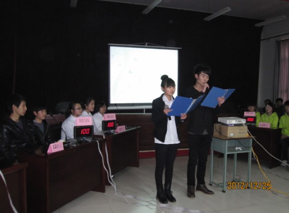 为提高学生对计算机基础知识的学习热情,丰富学生的课余生活,给广大学生提供一个展示自我的舞台,信息管理系于2012年12月25日下午16:30在实训楼报告厅举办了“计算机基础知识竞赛”。系主任孔丽琴、副主任王雪霞、团委书记张文斌、教学秘书侯亚君出席比赛现场,王雪霞、侯亚君两位老师担任评委。信息管理系11级、12级大专班全体学生观看了比赛。