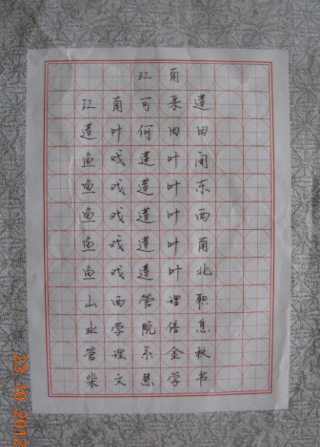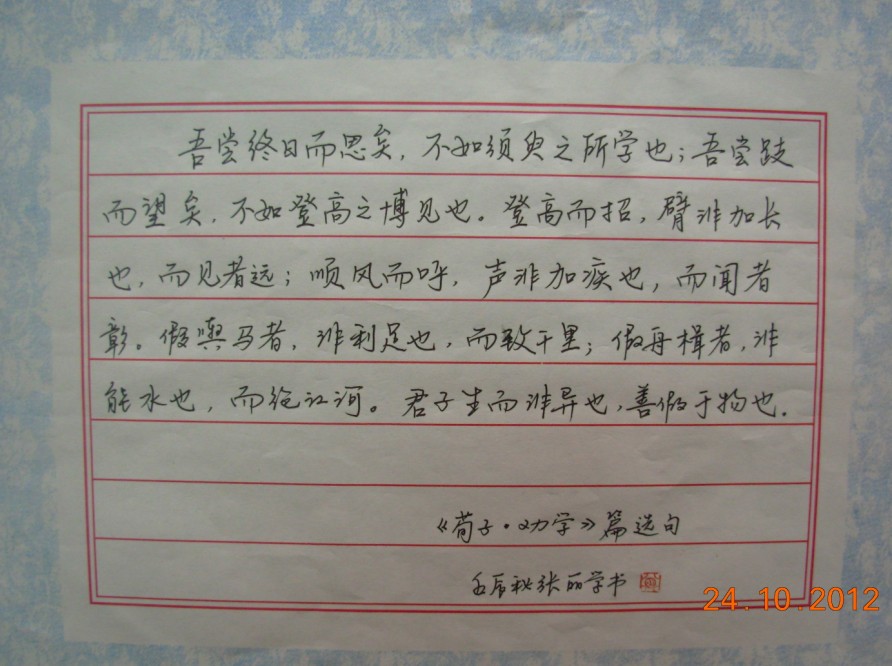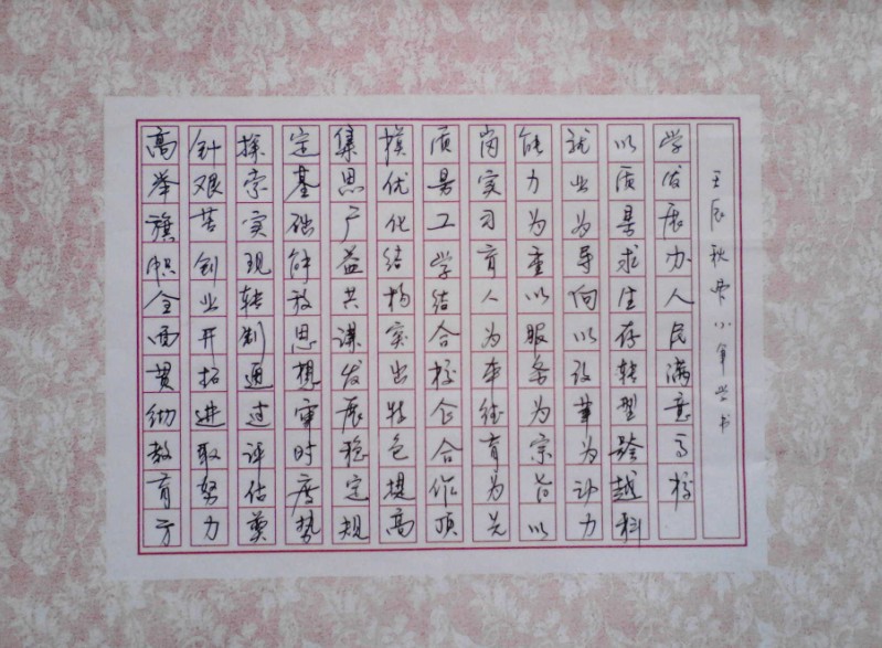 为了进一步提高教师的书写水平,形成良好书写习惯,提高教师的教学基本功,信息管理系组织了教师硬笔书法大赛。此次比赛要求教师在指定书法专用纸上完成一幅钢笔作品,内容和字体不限。为了让教师的书法作品更加规范,教师完成初稿后,信息管理系特邀请我院担任《书法》课程的岳俊萍老师为每幅作品进行指导并提出改进意见,最终教师完成作品。经岳俊萍老师评议,张丽、曹小军、