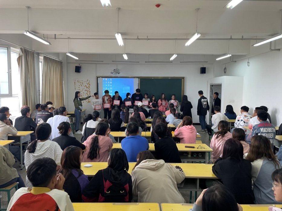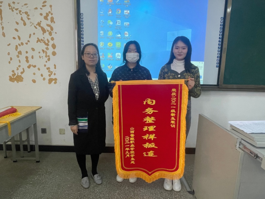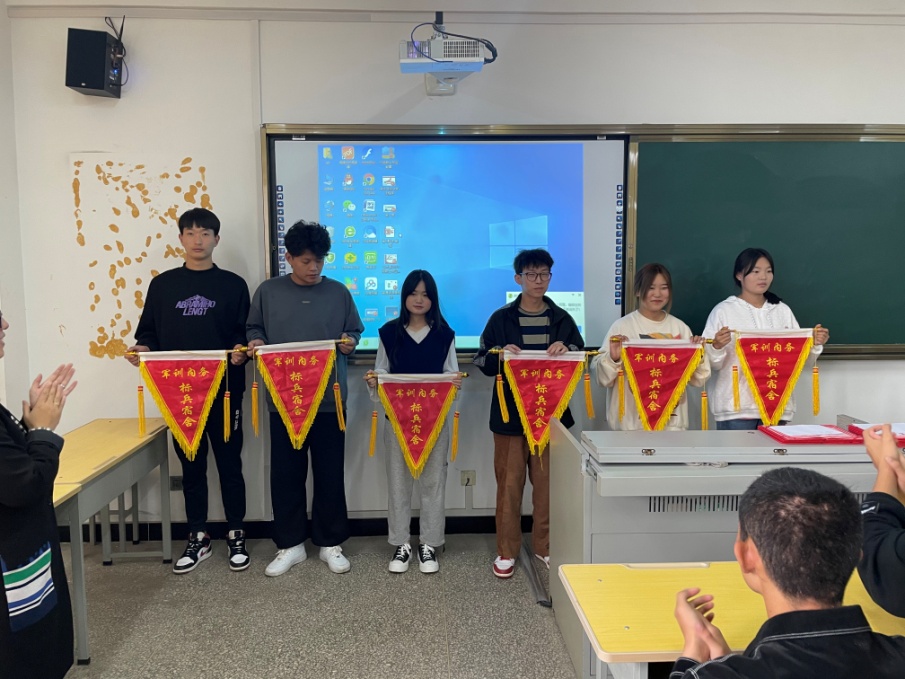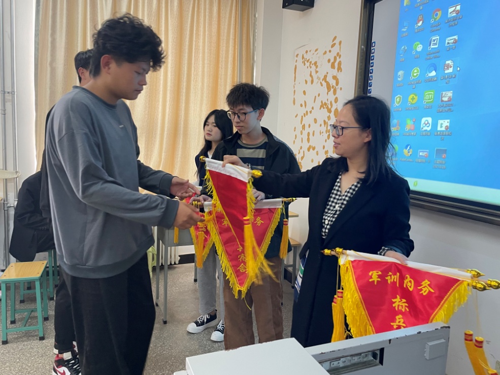 辅导员栗慧芳宣读2021级军训优秀连队、优秀个人名单。班主任白亚玮为军训中获得先进连队、军训内务标兵宿舍、军训标兵的同学颁奖。